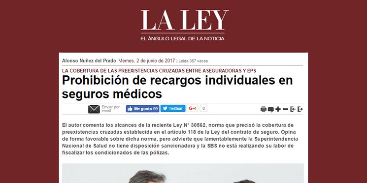 Nuestro Socio, Alonso Núñez del Prado, comenta en un artículo de La Ley el alcance que podría tener la reciente prohibición de recargos individuales en los seguros médicos.